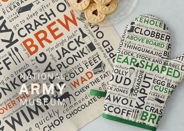 This bespoke typographic design for the National Army Museum gift shop, features Army Slang and is available on tea towels, mugs, cards, coasters, cushions, an apron and oven mitt in army green and beans orange.