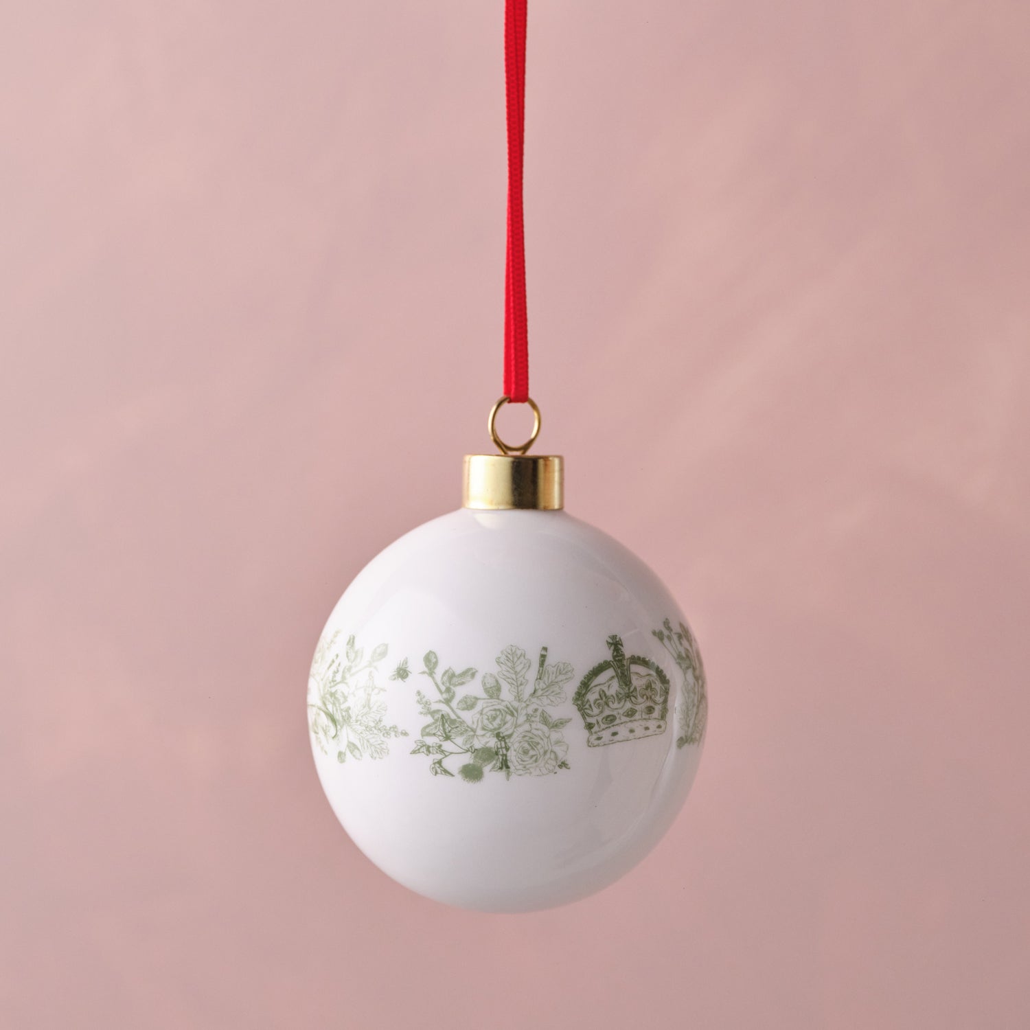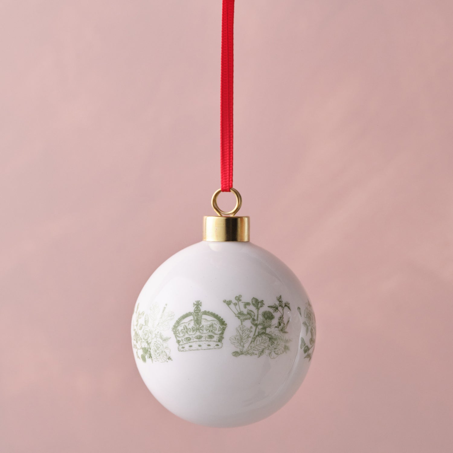 The King Charles III Coronation bauble bears the National flowers from the UK along with oak, a symbol of strength and stability, and Ivy, the symbol of commitment, which trails throughout this intricately hand-drawn design.