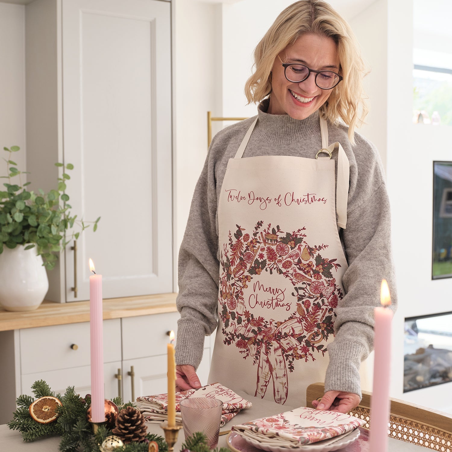 A charming new addition to our Twelve Days of Christmas collection, the Two Turtle Doves Apron features a delicate hand-drawn design of festive foliage adorned with tiny delights to celebrate each magical day of the season.