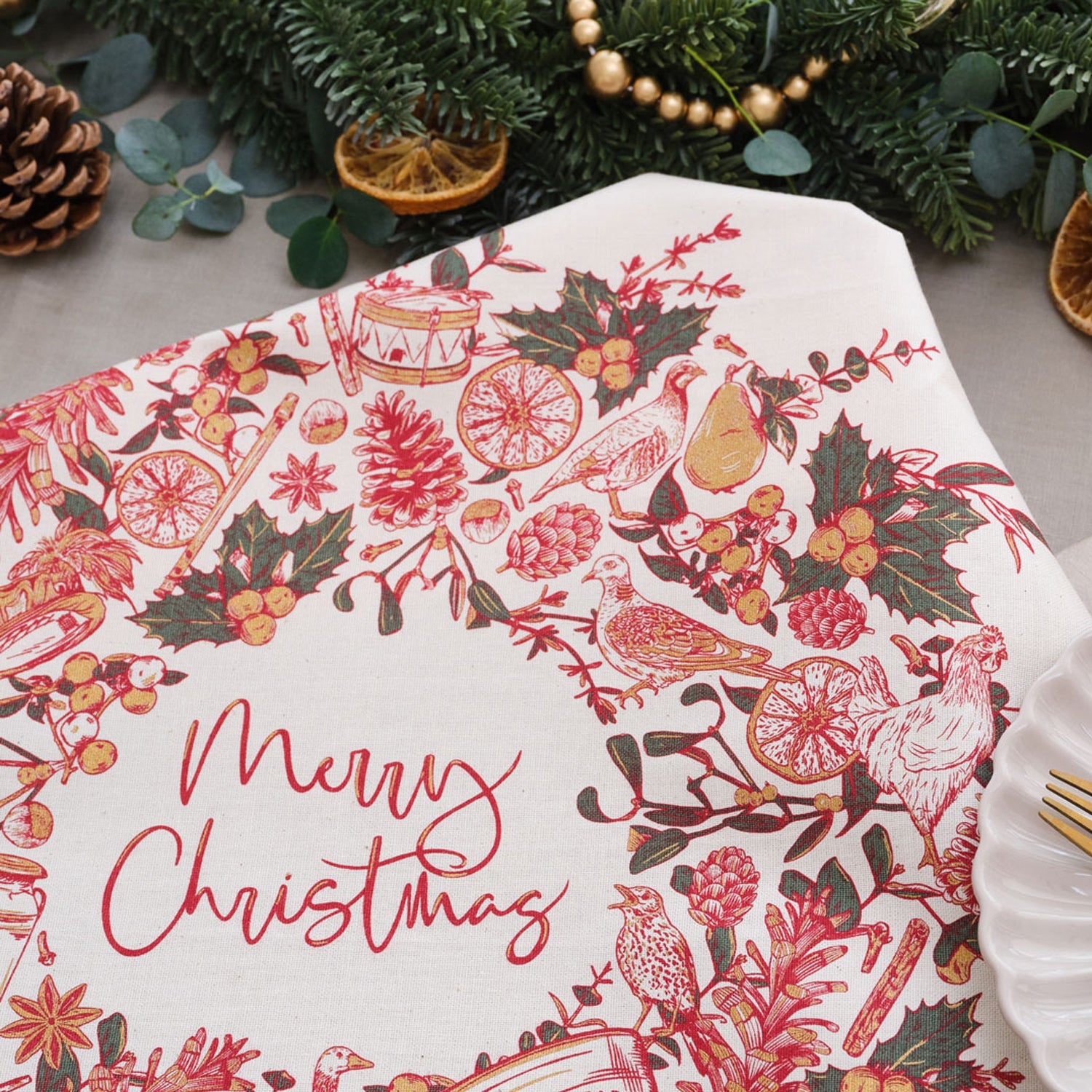 Thoughtfully screen printed in the UK onto 100% cotton using eco-friendly inks, these napkins bring warmth, charm, and sustainability to your festive table. Designed to perfectly compliment the Twelve Days of Christmas Collection.